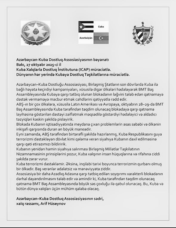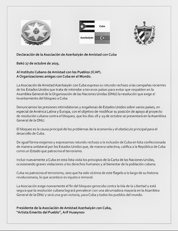 Por su parte, la Asociación de Amistad Azerbaiyán Cuba rechazó la intimidación de Estados Unidos sobre terceros países para evitar que respalden en la Asamblea General de la ONU la resolución que exige el fin del bloqueo económico, comercial y financiero contra la isla.