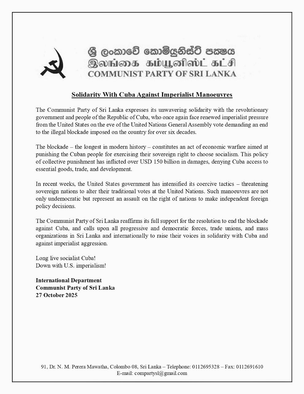 Estas maniobras, indicaron, no solo son antidemocráticas, sino que representan un atentado contra el derecho de las naciones a tomar decisiones independientes en su política exterior. Finalmente, el Partido Comunista de Sri Lanka reafirmó su pleno apoyo a la resolución para poner fin al bloqueo y llamó a todas las fuerzas progresistas y democráticas, sindicatos y organizaciones de masas de Sri Lanka e internacionales a alzar su voz en solidaridad con Cuba.