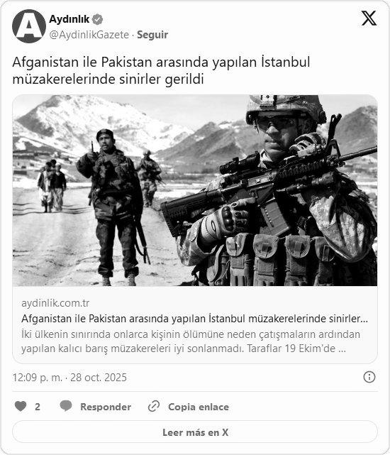 Una nueva ronda de negociaciones entre representantes de Pakistán y del Gobierno talibán de Afganistán concluyó este lunes 27 de octubre en Estambul sin resultados concretos, según confirmaron medios pakistaníes. Las conversaciones, que se extendieron durante tres días, estuvieron marcadas por desacuerdos en torno al accionar de grupos armados en la frontera común.