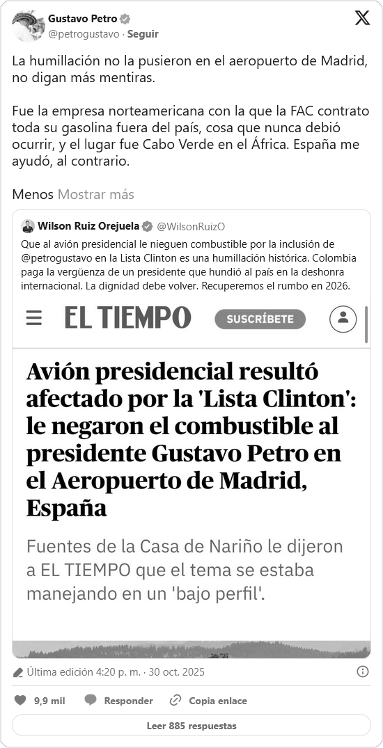 «La humillación no la pusieron en el aeropuerto de Madrid, no digan más mentiras. Fue la empresa norteamericana con la que la FAC contrató toda su gasolina fuera del país, cosa que nunca debió ocurrir, y el lugar fue Cabo Verde en el África. España me ayudó, al contrario», aclaró Petro.