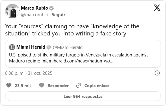 A través de su cuenta en la red social X, el funcionario descalificó un artículo del Miami Herald que detallaba los presuntos preparativos: «Tus ‘fuentes’, que afirmaban tener ‘conocimiento de la situación’, te engañaron para que escribieras una historia falsa».