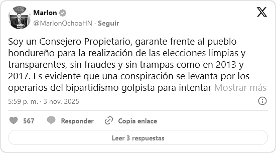 «La conspiración no se ha detenido y en mi condición como consejero propietario del Consejo Nacional Electoral y en mi obligación como garante de la democracia, me mantengo en su denuncia permanente. Y alerto al pueblo hondureño que existe un plan para ejecutar un fraude electoral, destruir el proceso electoral y desconocer los resultados de este próximo 30 de noviembre«, denunció Ochoa durante una conferencia de prensa.