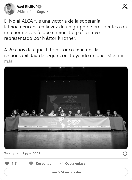 El gobernador de la provincia de Buenos Aires, Argentina, Axel Kicillof, clausuró este miércoles 5 de noviembre el encuentro en conmemoración de los 20 años de la Cumbre de los Pueblos y el «No al ALCA» en el Teatro Auditorium de Mar del Plata, marcando el cierre de dos jornadas de debate protagonizadas por organizaciones sociales, sindicales y políticas.