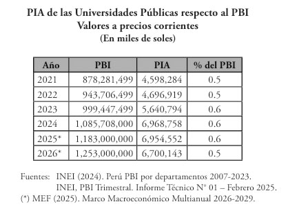 - Como señalamos en nuestro pronunciamiento del 27 de agosto, para que la docencia cumpla el importante papel de formación de nuevos profesionales, así como las tareas de investigación y desarrollo de nuevos conocimientos científicos, tecnológicos y humanísticos, requiere de remuneraciones justas. Esto no es posible dentro de los marcos de una política neoliberal que buscó destruir a la universidad pública para reemplazarla por el modelo privado. Una demostración de esto es que el Presupuesto Institucional de Apertura (PIA) de las universidades públicas para el año 2026 (tal como está planteado en el Proyecto de Ley de Presupuesto) será por segundo año consecutivo menor al del año 2024 y alcanzando sólo al 0.5 % del PBI, agregándose a ello la creación demagógica de decenas de nuevas universidades públicas por el Congreso de la República. Al respecto mostramos el siguiente cuadro: