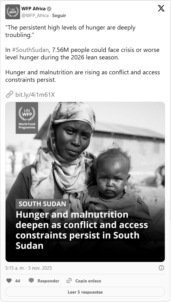 La Organización de las Naciones Unidas para la Alimentación y la Agricultura (FAO) indicó este miércoles sobre condiciones de hambruna en localidades de Sudán como El Fasher y Kadugli, a causa del conflicto armado que ha agudizado la inseguridad alimentaria en el país.