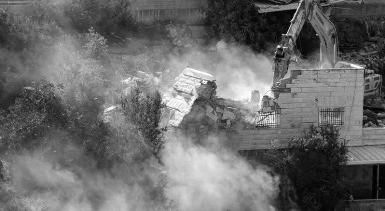 Una excavadora militar israelí demuele una casa perteneciente a una familia palestina en la aldea de Qatanna, en Cisjordania reocupada. Foto: Afp