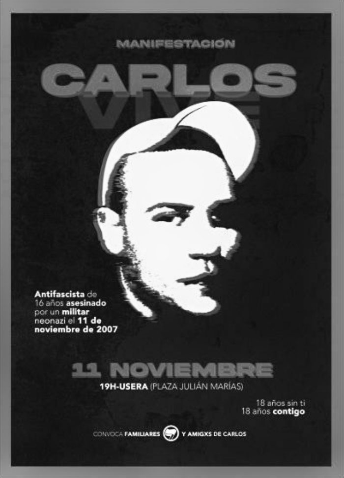 Carlos fue asasinado por Josué Estébanez, un militar que se dirigía a una concentración neonazi. No fue una pelea callejera, ni un accidente, ni un “exceso”. La justicia fue clara: la Audiencia Provincial de Madrid lo condenó a 26 años de prisión, aplicando la agravante de odio ideológico. Una sentencia confirmada en 2009. Fue, en todos los sentidos, un crimen fascista.