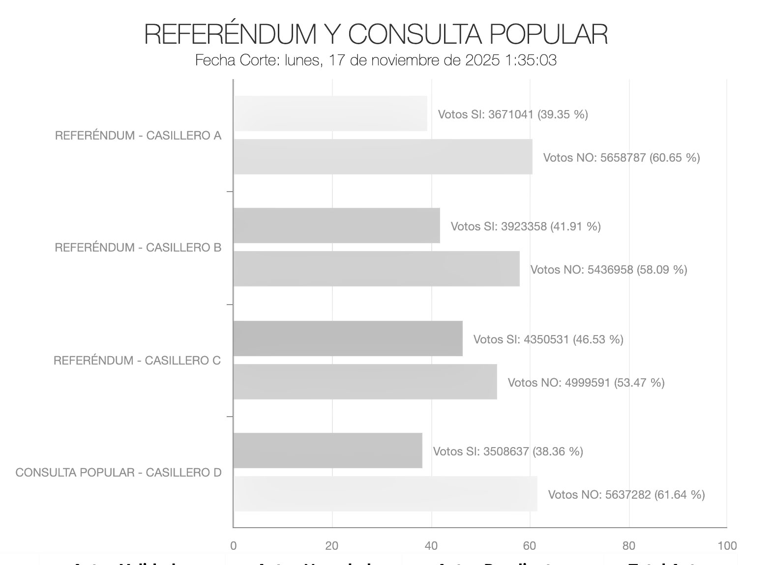 Más de 10 millones de ciudadanos ecuatorianos acudieron a las urnas para responder a las cuatro preguntas de la consulta promovida por Noboa. Con más del 96 por ciento de los votos escrutados, la opción del «No» resultó victoriosa en todas las cuestiones planteadas.