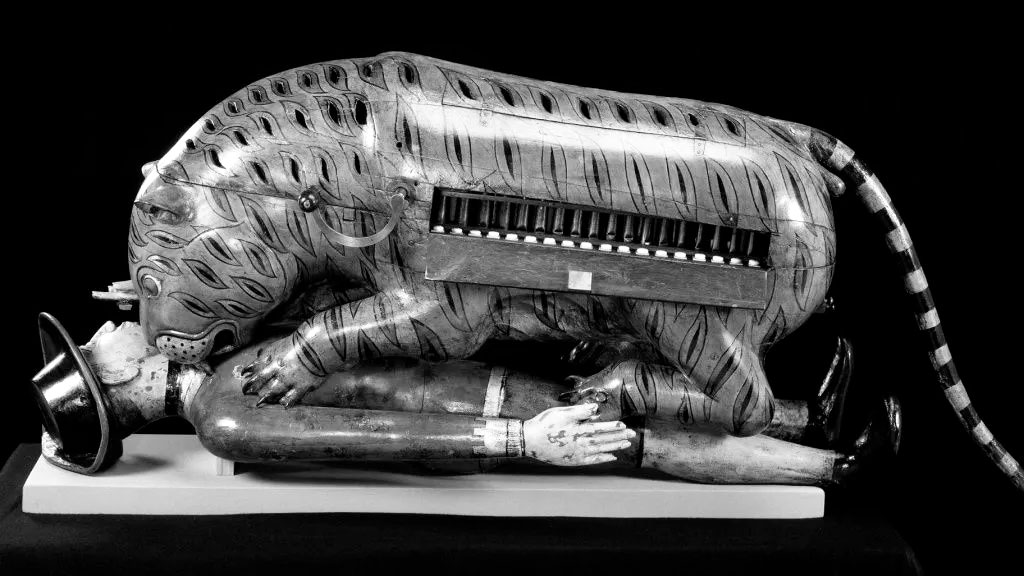 El Tigre de Mysore o el León de Mysore: así llamaban a Tipu Sultán, cuyo gobierno sobre el principado indio de Mysore se extendió desde 1782 hasta 1799. Ha pasado a la historia de la India como un héroe nacional que lideró la resistencia contra los colonizadores británicos durante las guerras anglo-mysore. Su principado fue el último en someterse a la Corona británica. El tigre, como símbolo de fuerza y lucha implacable, se convirtió en el emblema personal del Sultán. Esta imagen aparecía en su escudo, su armadura, sus armas y sus monedas, y decoraba las paredes del palacio y el trono del gobernante. No obstante, su encarnación más famosa fue un juguete mecánico de madera encargado por el propio Sultán: el Tigre de Tipu. La figura, que representa a un tigre atacando a un soldado británico, fue realizada casi a tamaño real. En un lateral del mecanismo había un órgano primitivo de 18 notas, y en su interior se ocultaba un complejo sistema que permitía al tigre rugir y al soldado gritar y mover el brazo.