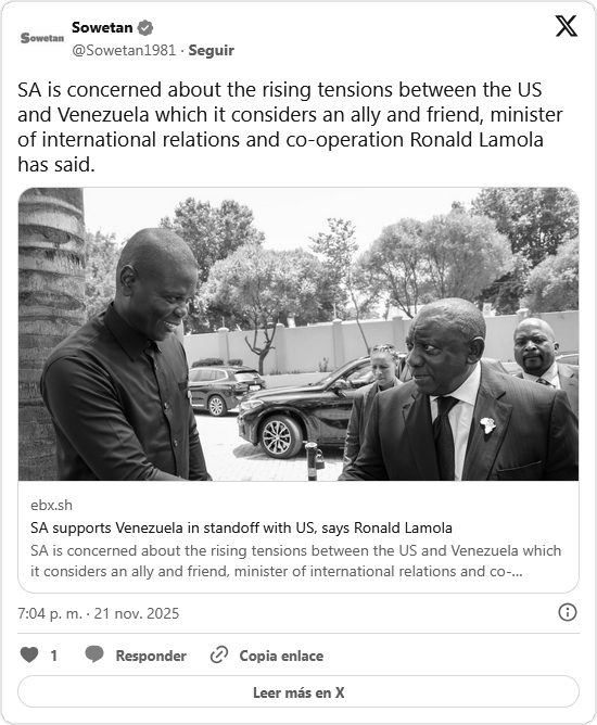 Sudáfrica también ha rechazado la exclusión de Venezuela de los diálogos regionales y ha criticado la negativa de EE.UU. a participar en la cumbre del G20 que organiza Pretoria. Lamola enfatizó que la región de América Latina y el Caribe ha sido declarada “zona libre de armas nucleares y zona de paz” por la Comunidad de Estados Latinoamericanos y Caribeños (CELAC), lo que refuerza la necesidad de preservar el marco de no uso de la fuerza.
