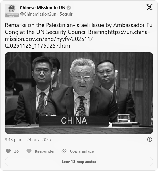 Fu concluyó recordando que China ha apoyado de forma consistente y firme la causa palestina y que seguirá impulsando todos los esfuerzos diplomáticos posibles para alcanzar una solución integral, justa y duradera al conflicto.