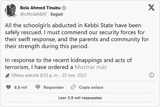 El presidente de Nigeria, Bola Tinubu, anunció el martes 25 de noviembre el rescate de 24 colegialas que fueron secuestradas la semana pasada en una escuela secundaria del estado de Kebbi, al noroeste del país.