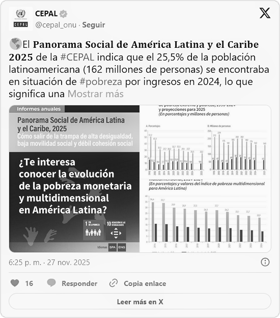 Gracias a este impulso, la pobreza por ingresos en América Latina alcanzó su punto más bajo en una década. El informe de la CEPAL indica que el 25,5 por ciento de la población vivía en condición de pobreza en 2024, lo que representa una disminución de 2,2 puntos porcentuales respecto a 2023 y un descenso superior a siete puntos desde 2020, el año más duro de la crisis sanitaria. La pobreza extrema también reflejó una mejora, ubicándose en el 9,8% en 2024.
