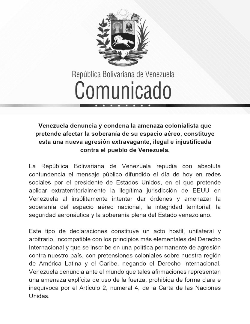 Caracas denunció que Trump, «insólitamente, intentar dar órdenes y amenazar la soberanía del espacio aéreo nacional, la integridad territorial, la seguridad aeronáutica y la soberanía plena del Estado venezolano».