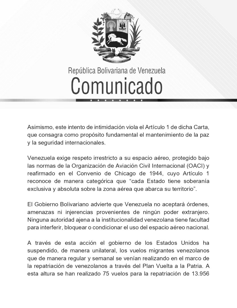 El comunicado también señala que con esta acción, la Administración Trump ha suspendido, «de manera unilateral», los vuelos de migrantes venezolanos que de manera regular y semanal se realizan en el marco de la repatriación de mediante el Plan Vuelta a la Patria, que hasta ahora ha permitido 75 vuelos y que 13.956 personas regresarán al país «con amor y solidaridad absoluta».
