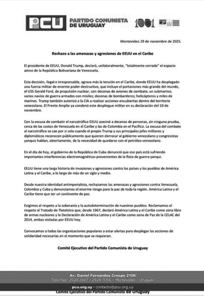 El Comité Ejecutivo del Partido Comunista de Uruguay (PCU) denunció las amenazas y agresiones de Estados Unidos que agravan la tensión en el Caribe. El PCU calificó de «ilegal e irresponsable» la decisión unilateral del presidente de Estados Unidos, Donald Trump, quien declaró «totalmente cerrado» el espacio aéreo de la República Bolivariana de Venezuela.
