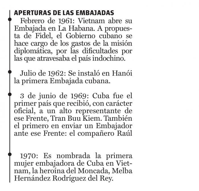 En fecha tan temprana de la Revolución Cubana, como noviembre de 1960, Fidel le indicó al Comandante Ernesto Guevara, quien encabezaba una visita a la URSS, que el viceministro de Relaciones Exteriores, Héctor Rodríguez Llompart, viajara a Hanói para establecer las relaciones diplomáticas entre ambas naciones.