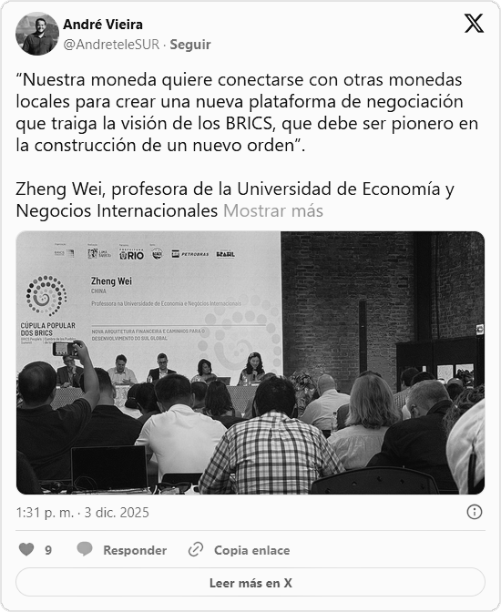 Esta propuesta, debatida en Río de Janeiro (donde tiene lugar la cumbre), busca abrir nuevos caminos para el desarrollo económico de las naciones emergentes. La profesora Zheng Wei, de la Universidad de Economía y Negocios Internacionales de China, destacó la visión contrahegemónica del proyecto.