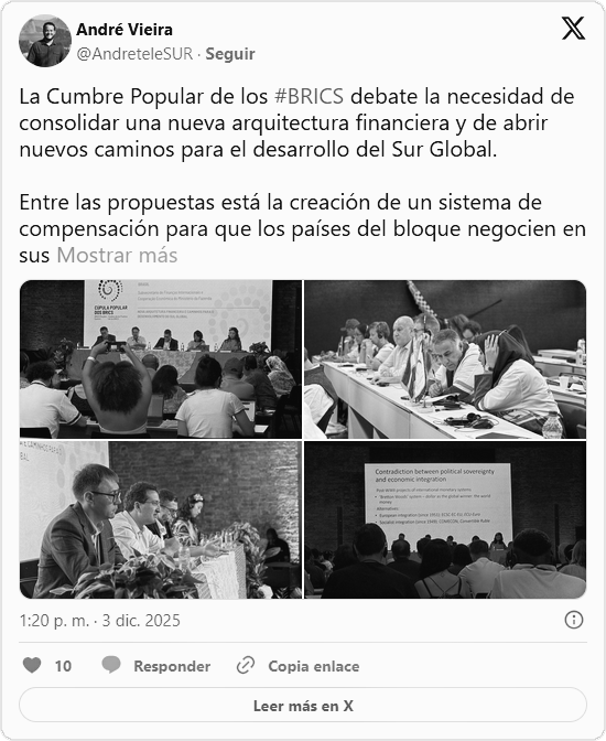 La Cumbre Popular del BRICS subraya la necesidad de consolidar una nueva arquitectura financiera para el Sur Global, con la creación de un sistema de compensación que permita a los países del bloque negociar en sus monedas locales, reduciendo la dependencia del dólar estadounidense.