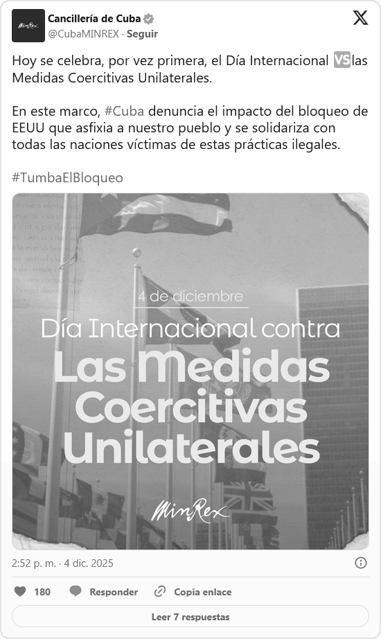 Desde el Gobierno cubano se ha condenado repetidamente las medidas coercitivas unilaterales, refiriéndose especialmente al bloqueo económico y comercial impuesto por EE.UU. contra la isla.