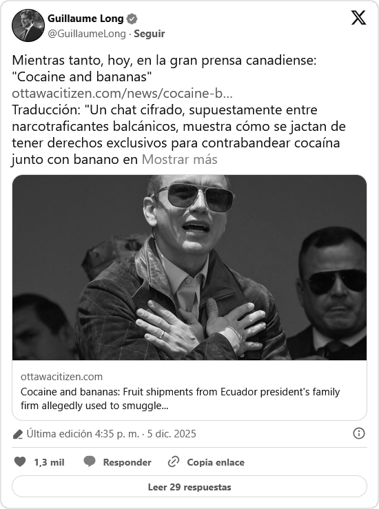 Respecto a las revelaciones de OCCRP, ni la presidencia de Ecuador ni Noboa Trading han respondido a las solicitudes de comentarios sobre la investigación.