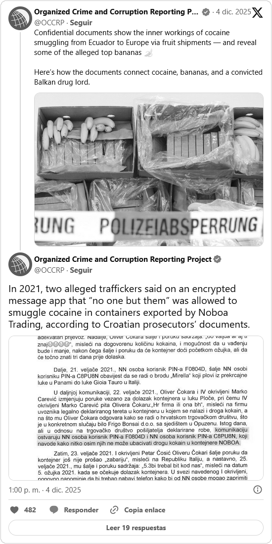 Una investigación internacional del Proyecto de Denuncia de la Corrupción y el Crimen Organizado (OCCRP) reveló que contenedores de banano despachados por Noboa Trading Co. TCN S.A., parte del conglomerado familiar del presidente de Ecuador, Daniel Noboa, fueron utilizados para el envío de grandes cargamentos de cocaína a Europa entre 2020 y 2021.