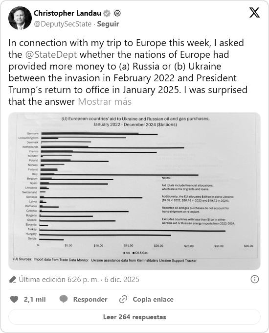 Landau explicó que decidió plantear al Departamento de Estado la pregunta de si las naciones de Europa habían aportado más dinero a Rusia o a Ucrania entre el estallido del conflicto y el regreso de Trump al cargo. «Me sorprendió que la respuesta fuera Rusia, ¡y por mucho! Sabía que muchos de estos países habían vinculado su futuro energético a Rusia, pero no tenía ni idea de hasta qué punto, ni de cómo (en conjunto) eso empequeñecía su ayuda a Ucrania«, expresó.