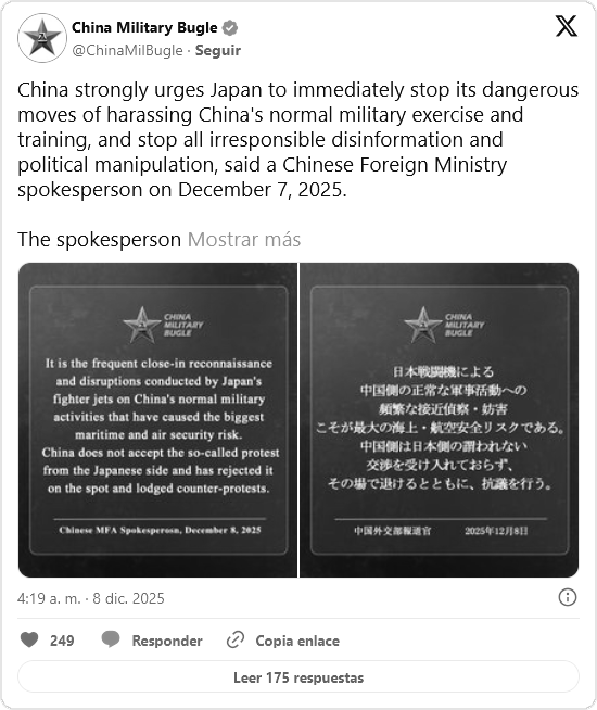 Las tensiones entre ambos países se agudizaron en noviembre, luego de que la primera ministra de Japón, Sanae Takaichi, asegurara que Tokio respondería con medidas si Beijing despliega fuerzas militares en Taiwán, lo que originó una serie de críticas y advertencias por parte del gigante asiático, como la imposición de sanciones, la suspensión de las relaciones económicas, diplomáticas y militares, y una restricción del comercio.