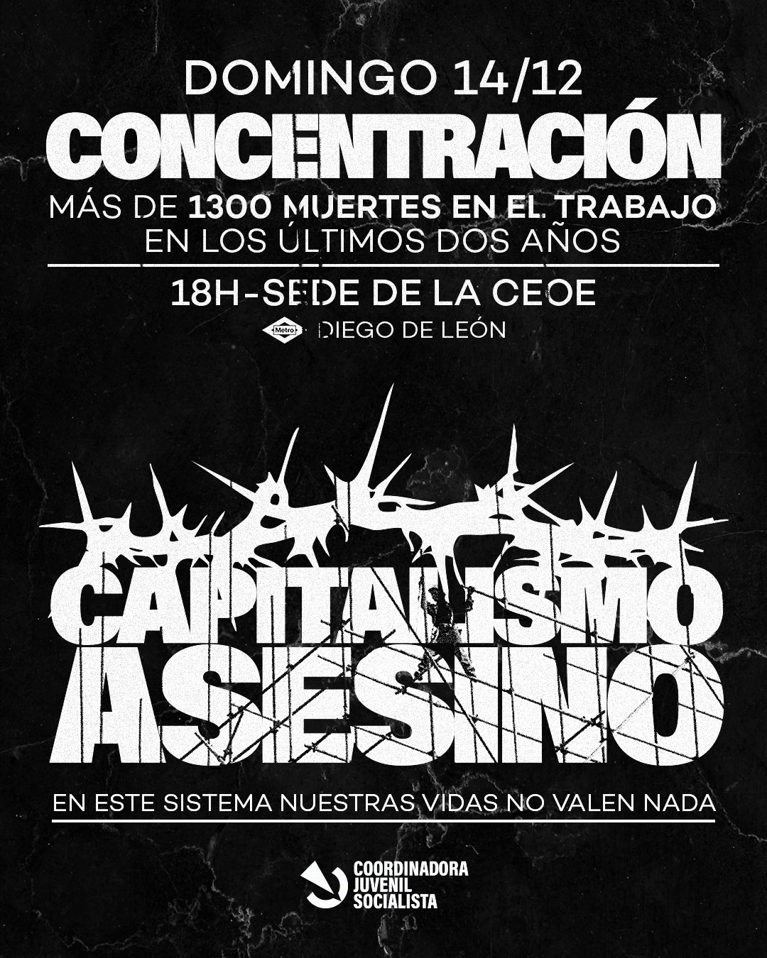 La Coordinadora Juvenil Socialista (CJS) ha convocado para el próximo domingo, 14 de diciembre, a las 18:00 horas, a una concentración frente a la sede de la CEOE para denunciar las muertes en el trabajo.
