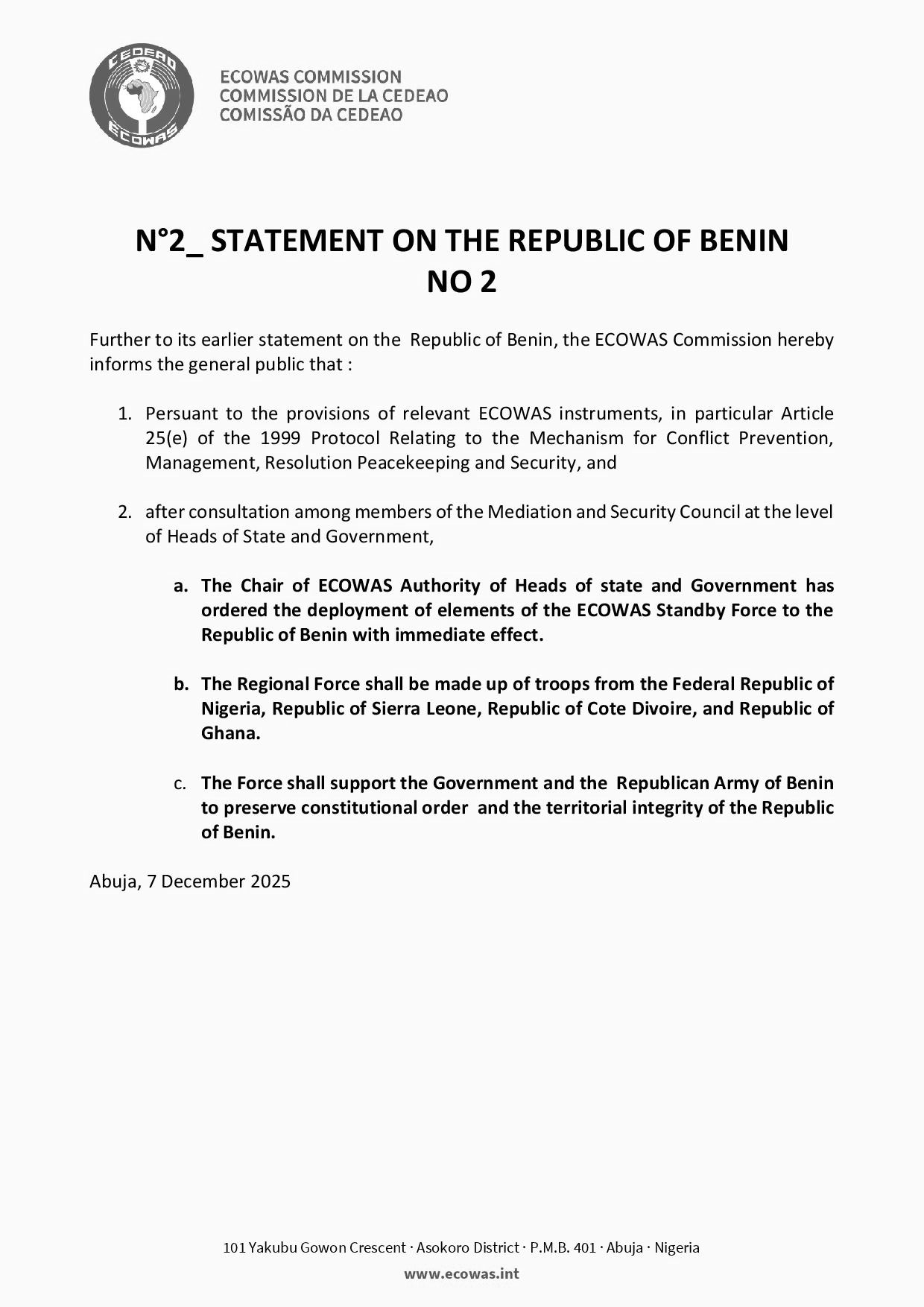Tras frustrarse el golpe, la Comisión de la Comunidad Económica de Estados de África Occidental (Cedeao) juntó con la Unión Africana condenó la intentona golpista, anunció que iba a enviar unidades de la Fuerza de Reserva a Benín para ayudarle a restablecer el orden en el territorio nacional.