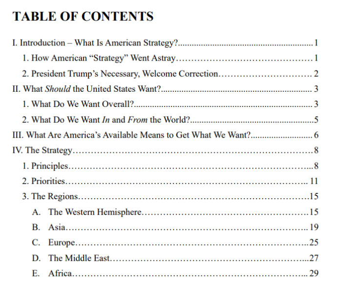 No hay por qué considerar que esta historia de los dos documentos sea descabellada. Porque el documento conocido es tan simple que es difícil pensar que es el real y que no hay algo más en el trasfondo. Si os fijáis en el índice que os pongo, es mucho menos que un trabajo escolar. Así que sí, hay que pensar que hay otro mucho más extenso y serio. Uno, por ejemplo, donde se dice que las relaciones entre EEUU y Europa se tienen que centrar en unas pocas naciones (Austria, Hungría, Italia y Polonia) y en las organizaciones políticas afines al trumpismo en el resto. Priorizar estos sectores, evidentemente, pero sin olvidar al resto de fuerzas «proestadounidenses».
