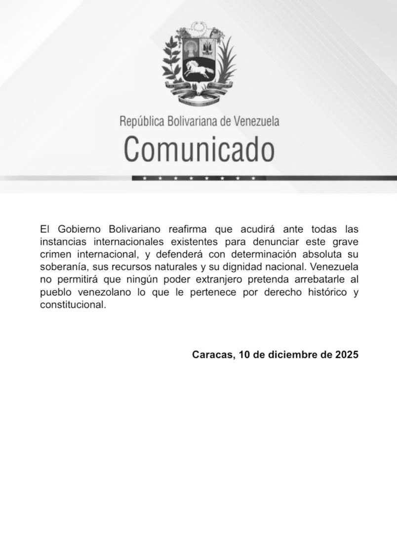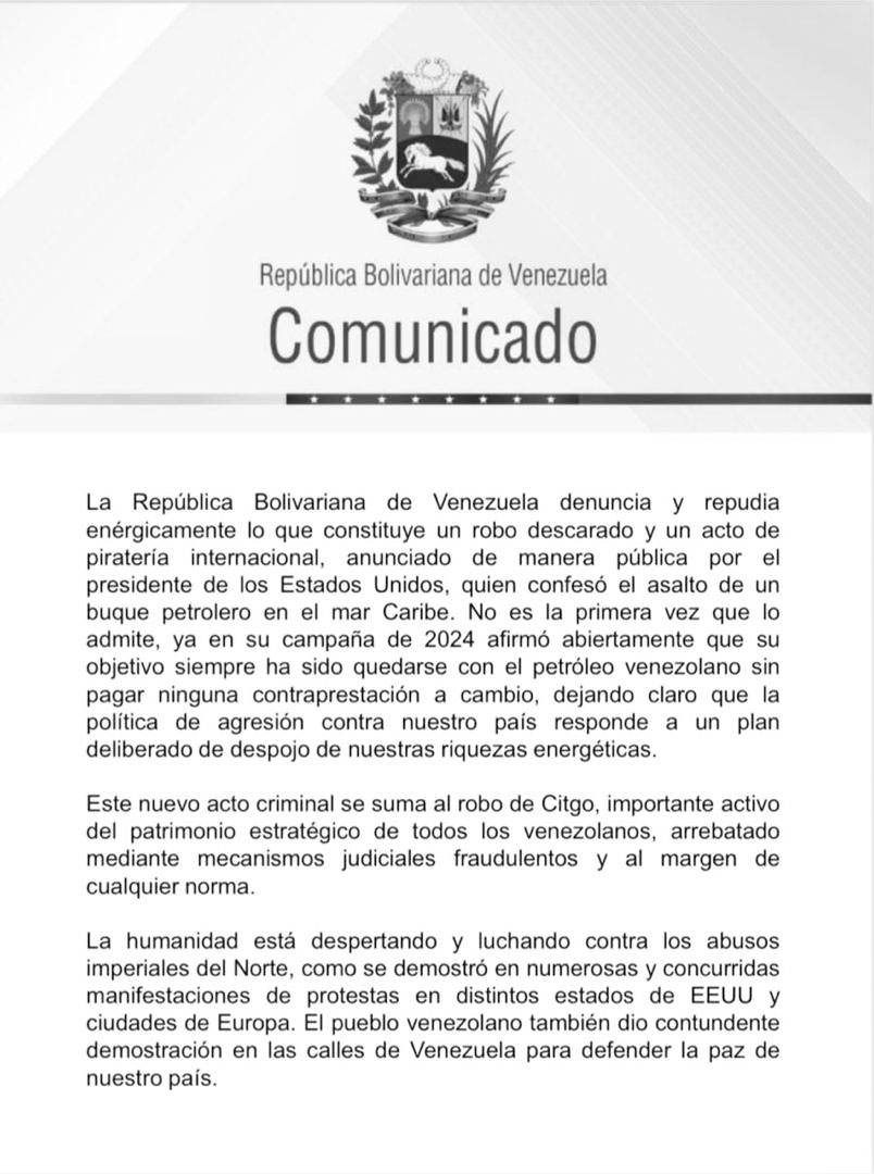 El comunicado apuntó directamente al presidente estadounidense, Donald Trump, por haber anunciado públicamente la operación: «La República Bolivariana de Venezuela denuncia y repudia enérgicamente lo que constituye un robo descarado y un acto de piratería internacional, anunciado de manera pública por el presidente de los Estados Unidos, quien confesó el asalto de un buque petrolero en el mar Caribe».