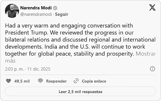 Modi confirmó el diálogo a través de su cuenta de X, señalando que ambos mandatarios “revisaron los avances en las relaciones bilaterales y discutieron desarrollos regionales e internacionales”. Agregó que India y Estados Unidos “seguirán trabajando juntos por la paz, la estabilidad y la prosperidad global”.