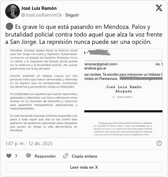 La AMPAP emitió un comunicado este viernes 12 de diciembre manifestando su «más enérgico y absoluto repudio a la violenta represión» ejecutada por el Gobierno de Alfredo Cornejo, gobernador de Mendoza. Calificaron la acción como un «grave atropello a las libertades democráticas y los derechos humanos» contra ciudadanos que ejercían su derecho constitucional a la protesta.