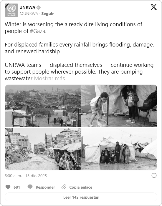 Además de las víctimas causadas mediante ataques directos, Israel provoca la muerte de decenas de personas en Gaza en medio del invierno, en tanto bloquea la entrada de suministros para la construcción de viviendas temporales para los palestinos, y su destrucción de gran parte de la infraestructura civil del enclave tiene repercusiones mortales en medio de una tormenta: al menos una decena de personas han fallecido tras el derrumbe de edificios previamente bombardeados por el ente sionista.