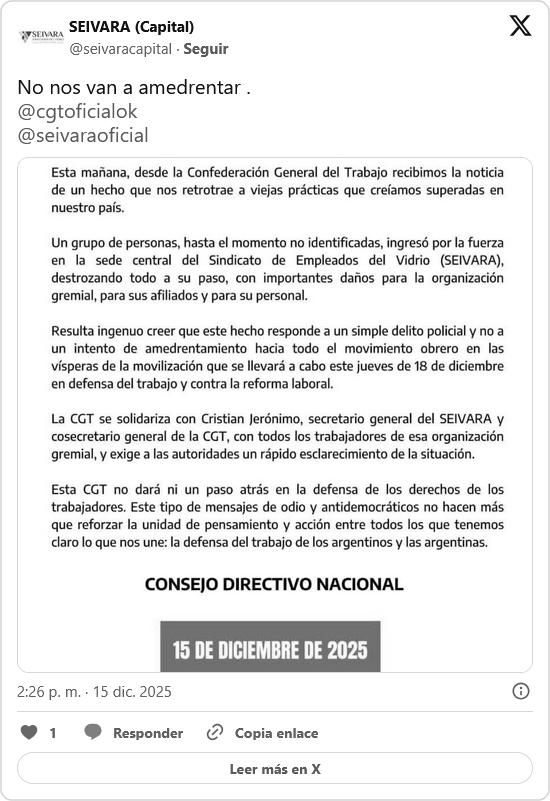 Para los dirigentes del SEIVARA, el hecho constituye un claro acto de intimidación, especialmente después de que la CGT rechazara de forma unánime el proyecto de reforma laboral presentado por el oficialismo.