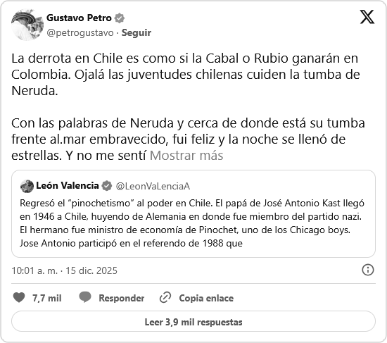 El jefe de Estado de Colombia envió un mensaje preocupante sobre el respeto a los derechos humanos y la condena de los crímenes atroces perpetrados contra la población: «La derrota en Chile es como si la Cabal o Rubio ganaran en Colombia. Ojalá las juventudes chilenas cuiden la tumba de Neruda«, escribió.