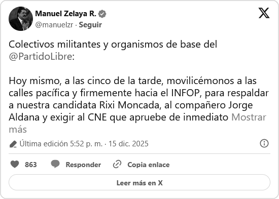 Con un plazo perentorio para que el CNE declare un ganador oficial el 30 de diciembre, la presión en las calles se suma a la institucional. Libre plantea la movilización como un ejercicio democrático para defender, según proclama, la voluntad popular frente a lo que considera un «golpe electoral» en ciernes.
