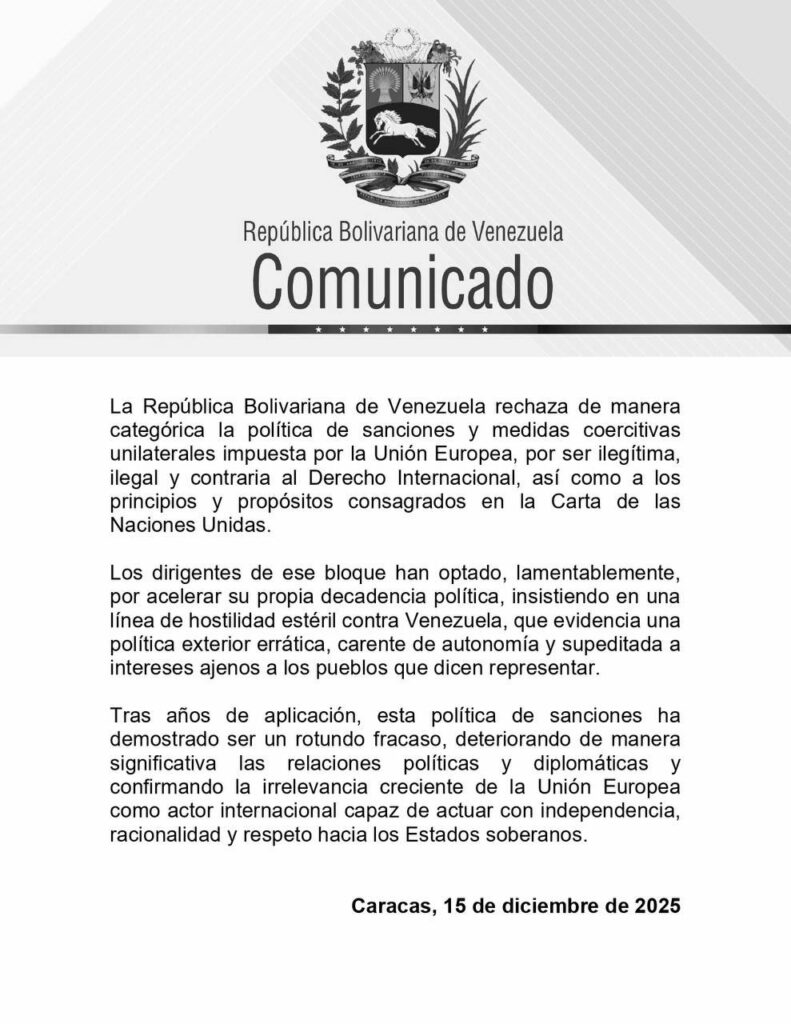 La respuesta de Caracas fue difundida a través de un comunicado fechado el 15 de diciembre, en el cual el Gobierno venezolano no solo rechazó las sanciones, sino que las presentó como una muestra de desacuerdo profundo con la legitimidad de la intervención europea. “Los dirigentes de ese bloque han optado, lamentablemente, por acelerar su propia decadencia política, insistiendo en una línea de hostilidad estéril contra Venezuela”, señala el texto oficial.