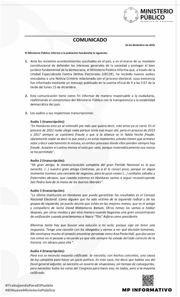Anteriormente, la Fiscalía también hizo referencia a una conversación en la que se menciona a Nasry Asfura, candidato del Partido Nacional y supuesto ganador declarado de las elecciones del 30 de noviembre, como figura central en un posible escenario de “unificación” política que requeriría “mayoría calificada” en el Congreso. Esto, en un contexto donde el Consejo Nacional Electoral (CNE) aún no ha completado el escrutinio de las actas impugnadas por diversos partidos.