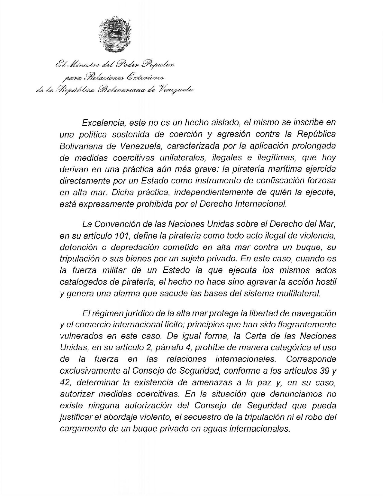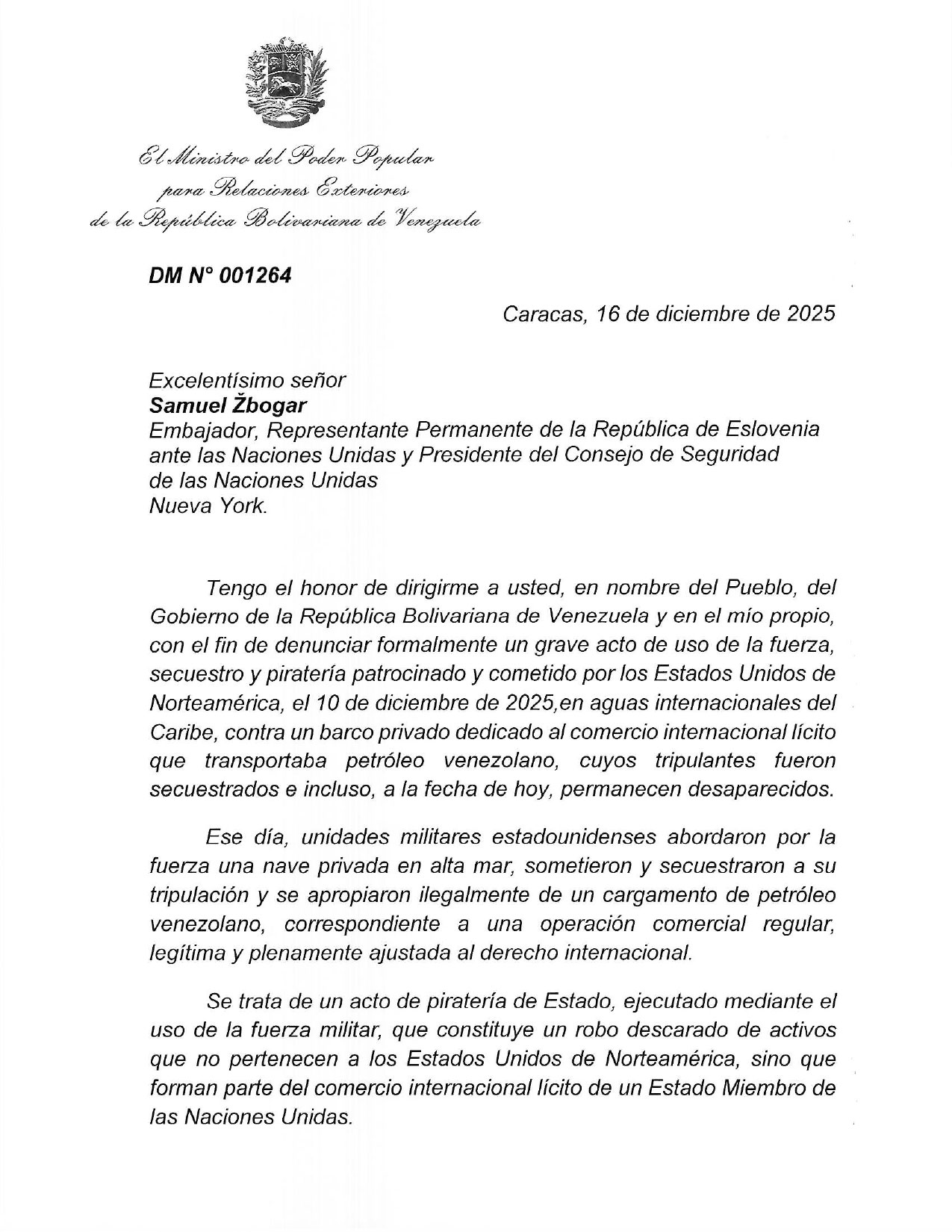 El representante permanente de Venezuela ante las Naciones Unidas, Samuel Moncada, presentó una misiva formal ante el Consejo de Seguridad en la que denuncia el abordaje, secuestro y robo de un cargamento de petróleo venezolano en aguas internacionales por parte de Estados Unidos, calificándolo como un acto de “piratería marítima ejercida directamente por un Estado”.