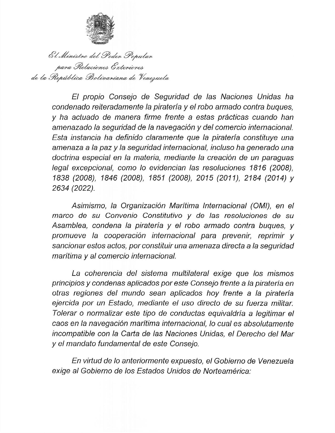 Finalmente, el Gobierno bolivariano solicitó que se reafirme, por vía escrita, que no existe ninguna resolución que autorice acciones contra Venezuela ni contra su comercio de petróleo, y que la comunicación sea distribuida como documento oficial del Consejo a todos los Estados miembros.