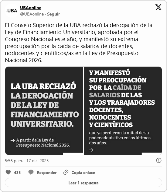 La UBA recordó que durante 2025 ya declaró la emergencia presupuestaria y reiteró la emergencia salarial para su personal, debido a la desactualización de las partidas y a la pérdida del poder adquisitivo de los salarios, que supera el 40 por ciento en comparación con diciembre de 2023.