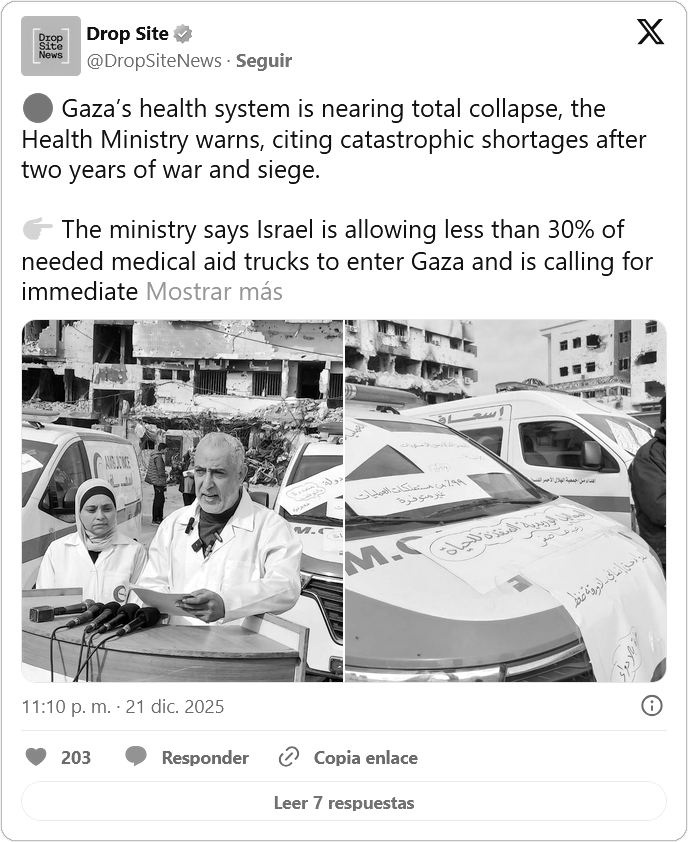 El sistema sanitario de la Franja de Gaza se encuentra en un grave estado de deterioro sin precedentes tras dos años de guerra y un bloqueo total. Esto ha provocado una drástica disminución de su capacidad para prestar servicios de diagnóstico y tratamiento, junto con una grave escasez de medicamentos”, indicó un comunicado.