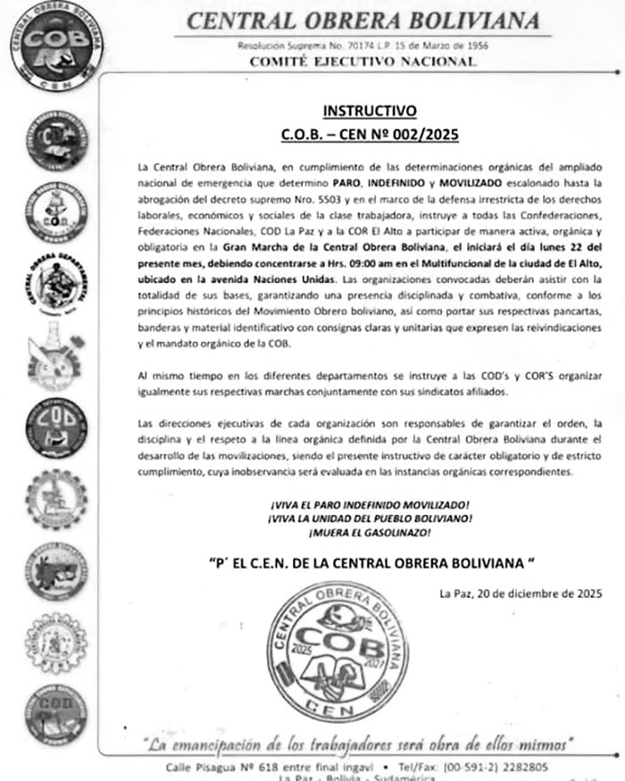 Mayor sindicato de Bolivia confirma huelga contra «gasolinazo» de Rodrigo Paz