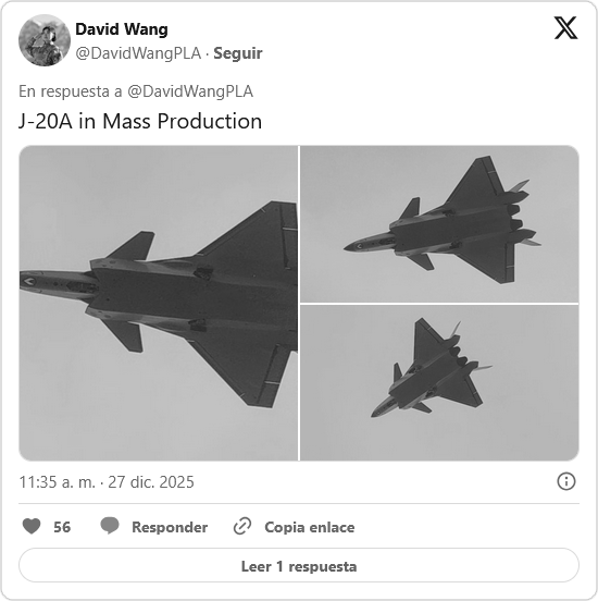 La aeronave entró en producción en masa y comenzó su despliegue operativo, marcando un momento histórico para la industria aeronáutica china tras décadas de desarrollo y recuperación tecnológica. En las redes sociales se han compartido imágenes y videos que muestran la versión más reciente del J-20A en pleno vuelo.