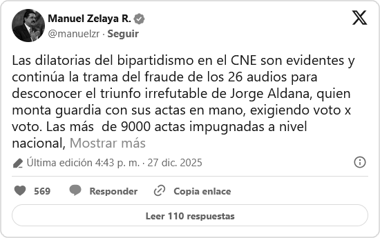 En su declaración pública, Zelaya afirmó: “Las dilatorias del bipartidismo en el CNE son evidentes y continúa la trama del fraude de los 26 audios para desconocer el triunfo irrefutable de Jorge Aldana, quien monta guardia con sus actas en mano exigiendo voto por voto. Las más de 9,000 actas impugnadas tampoco serán escrutadas al paso que van”.