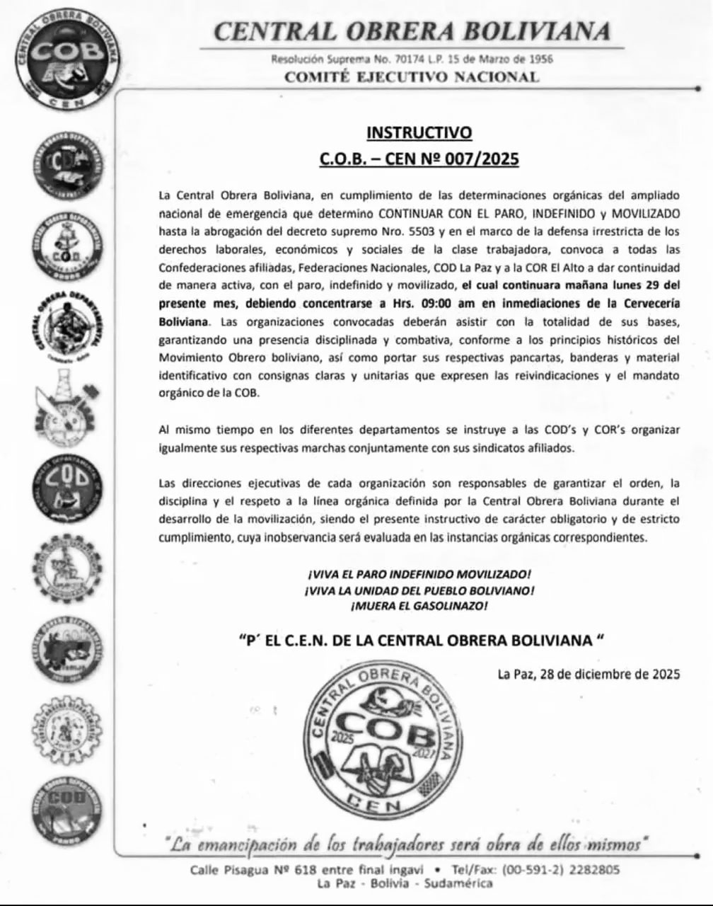 La Central Obrera Boliviana (COB) anunció este domingo que este lunes continuará con el paro indefinido y movilizado que lleva adelante en rechazo al Decreto Supremo 5503, emitido por el presidente Rodrigo Paz y catalogado por el pueblo como el «Gasolinazo».