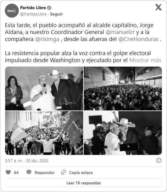 «Nosotros no reconocemos a presidente del fraude. Las elecciones son nulas, porque no contaron todos los votos, aparatos biométricos, cuadernillos. El Consejo Nacional Electoral (CNE) violó la soberanía popular», manifestó Moncada durante una concentración popular frente al edificio del Consejo Nacional Electoral (CNE) en Tegucigalpa.
