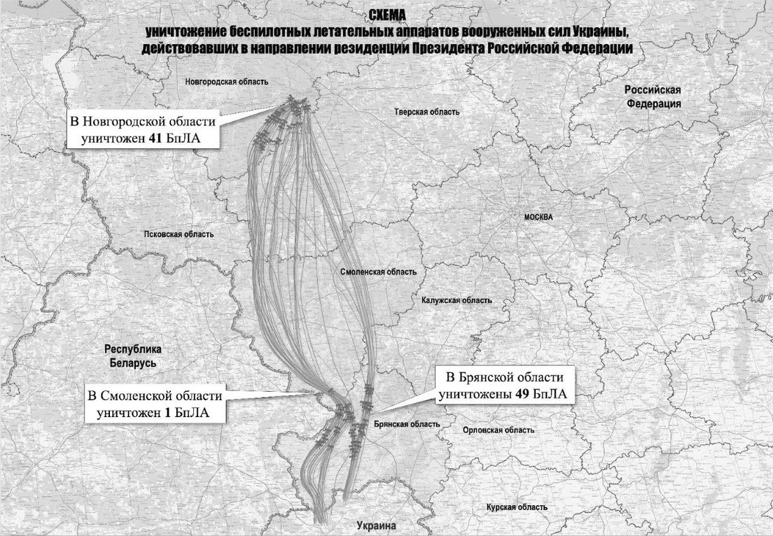 El ministerio de Defensa de Rusia compartió el miércoles un mapa que muestra las rutas y el esquema de destrucción de los vehículos aéreos no tripulados de las Fuerzas Armadas de Ucrania que operaban en dirección a la residencia oficial del presidente de Rusia, Vladímir Putin.
